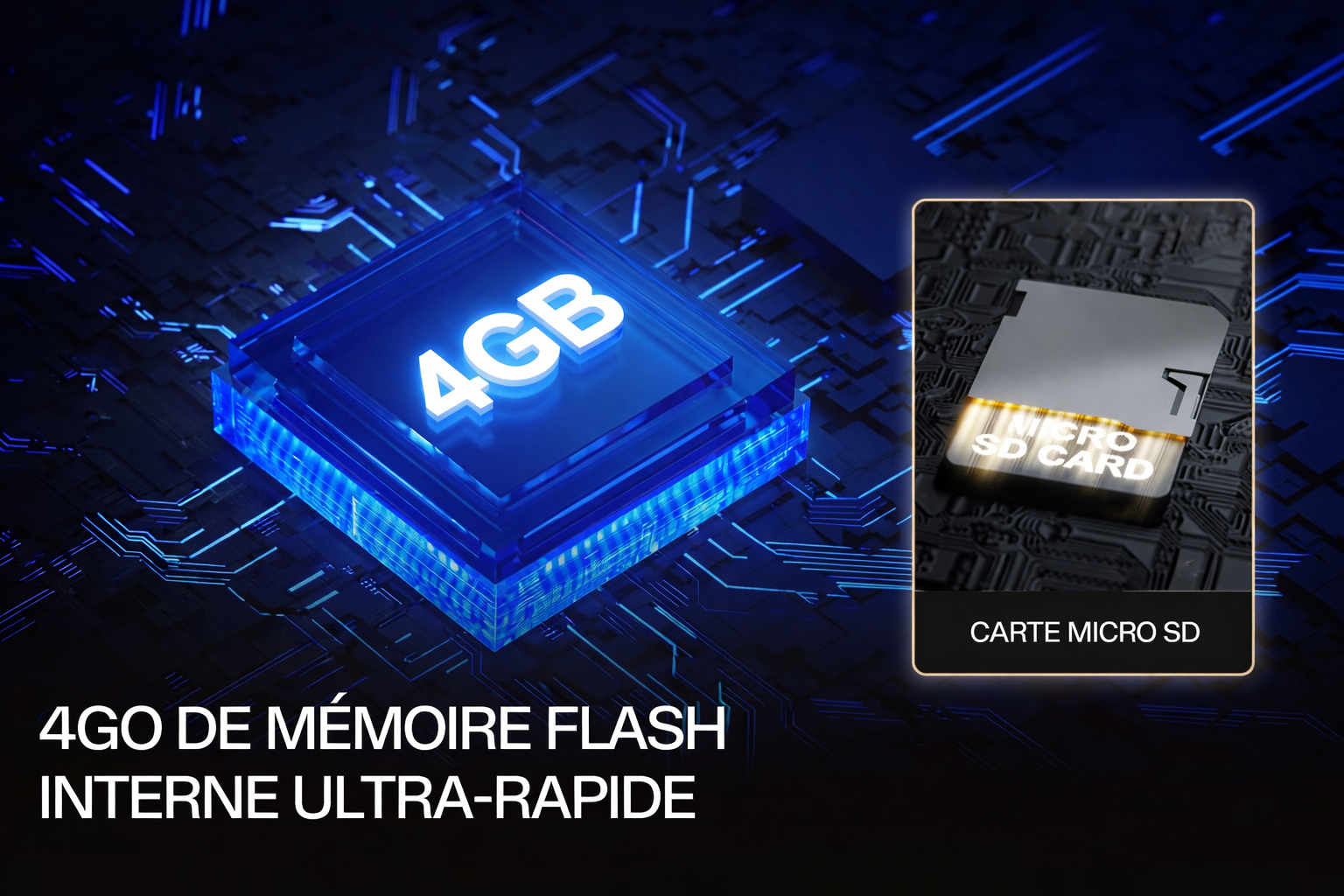 Mémoire : mémoire flash intégrée de 4 Go et prise en charge des cartes microSD externes.