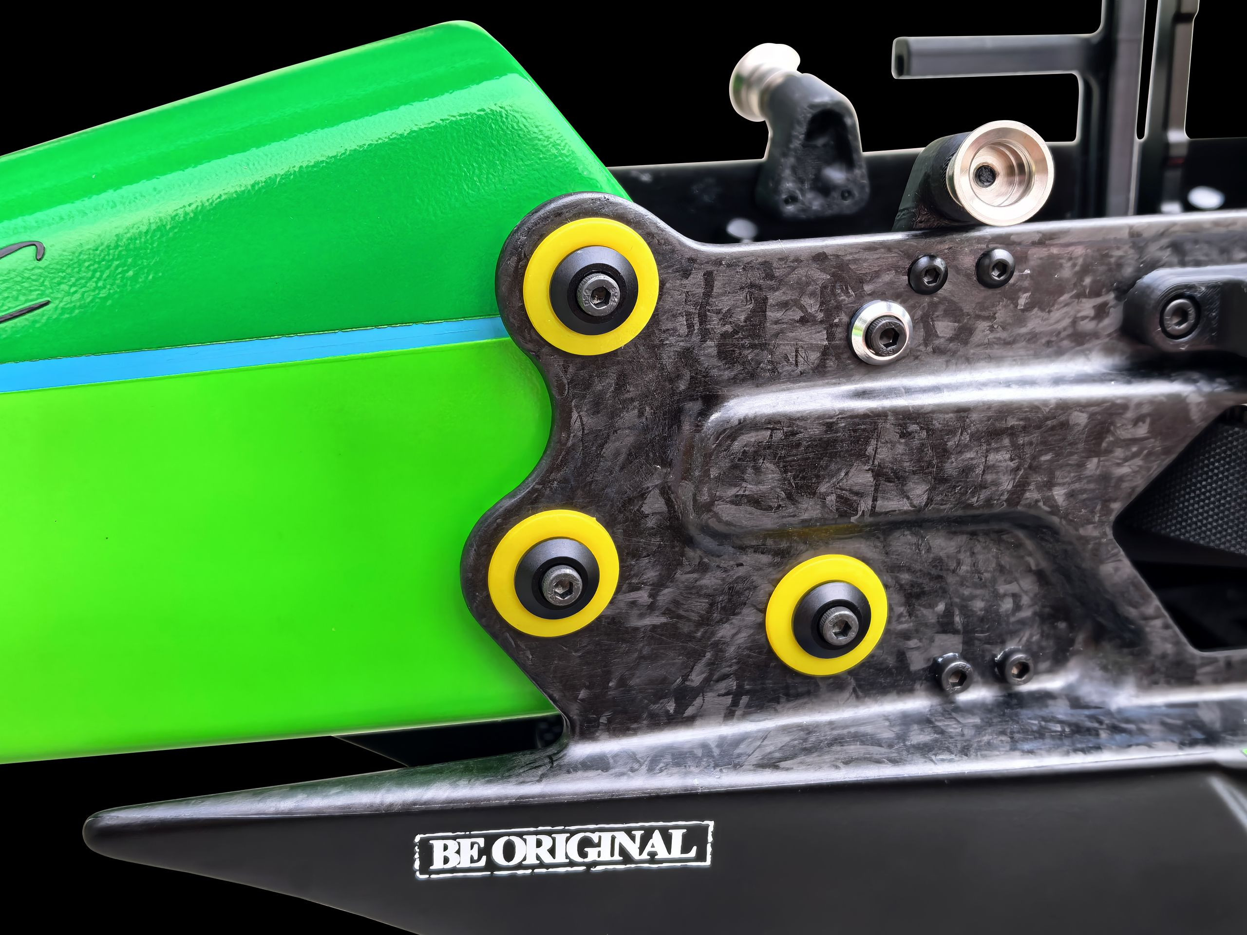 La tige en carbone est positionnée à l'intérieur de la poutre de queue, lui conférant une allure épurée et aérodynamique.